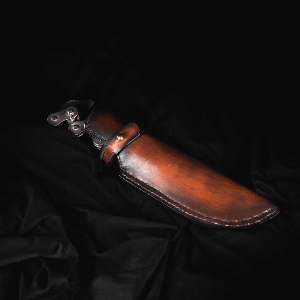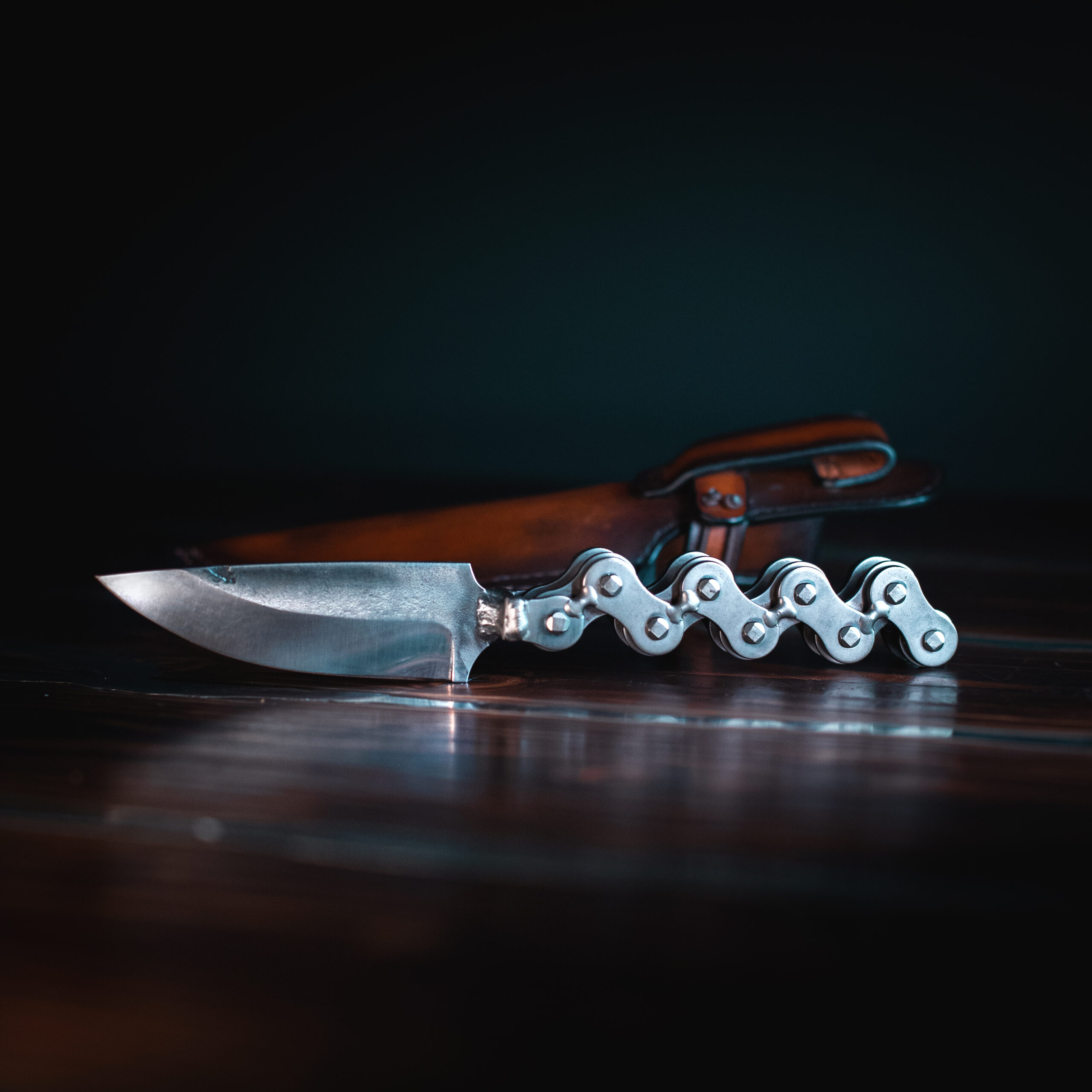 Pièce née d’un dialogue entre 3 artistes, une lame forgée par le coutelier Patrice Perée, un manche façonné et assemblé en atelier autour de maillons de chaîne et un étui en cuir patiné signé Atelier Serpico. Ce couteau a été tiré en trois exemplaires, un pour chacun des créateurs, comme trois éclats d’un même geste, transmis des mains qui l’ont façonné à celles qui le portent encore.