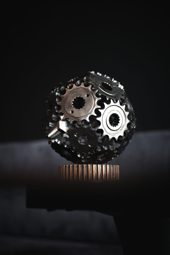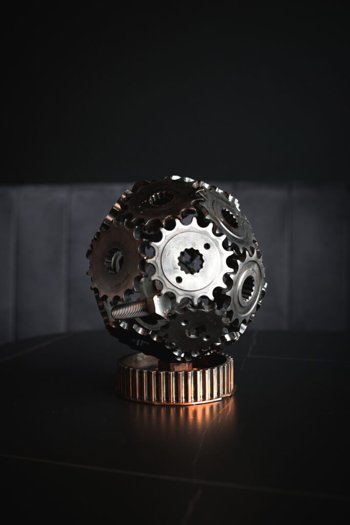 Assemblage structural en forme d’icosaèdre, composé exclusivement de pignons et d’engrenages récupérés . Chaque face est soudée au millimètre, créant une géométrie brute mais parfaitement cohérente comme un mécanisme sans fonction. La base est une poulie électrolysée dans un bain de cuivre pour lui offrir une teinte chaude et contrastée tel un socle d’une relique imaginaire d’un atelier oublié, où la mécanique serait mystérieuse.