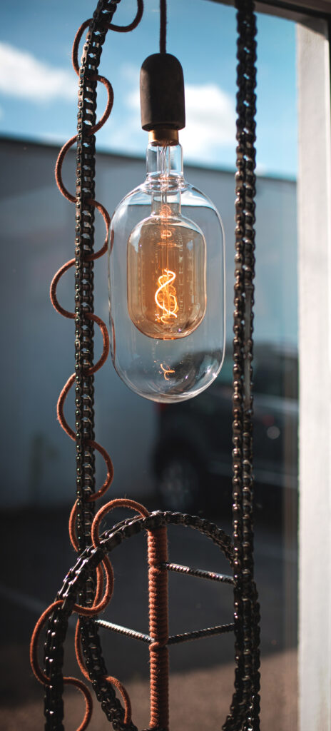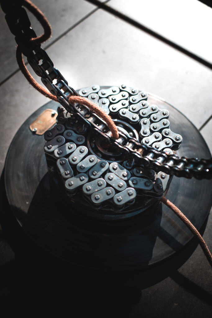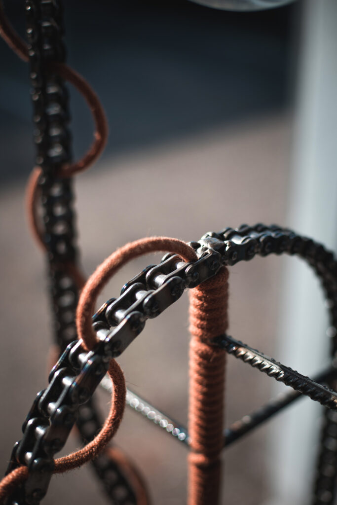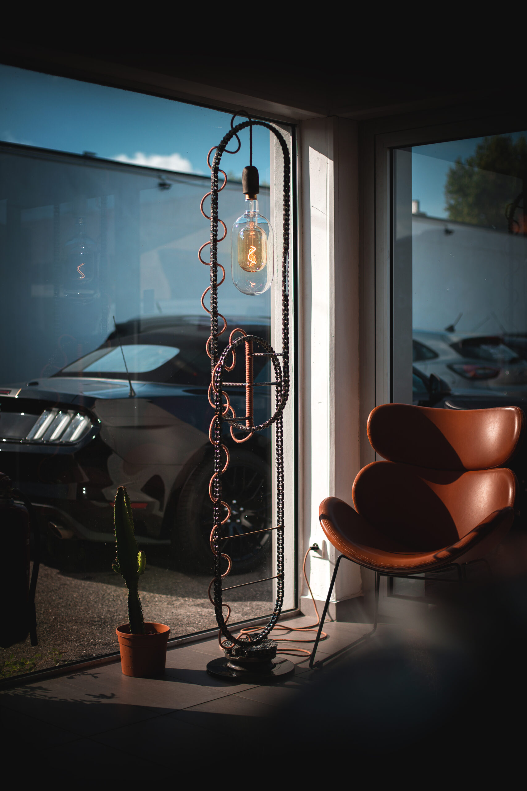 Cette lampe explore la manière dont la mécanique peut devenir architecture. Erigée à partir de plusieurs chaînes, sa structure s’étire en une colonne verticale où le brut dialogue avec la lumière. L’ampoule suspendue comme un coeur battant, révèle la poésie silencieuse des matériaux techniques et transforme l’objet en présence. A la fois fonctionnelle et symbolique, cette lampe incarne la tension entre utilité et contemplation.