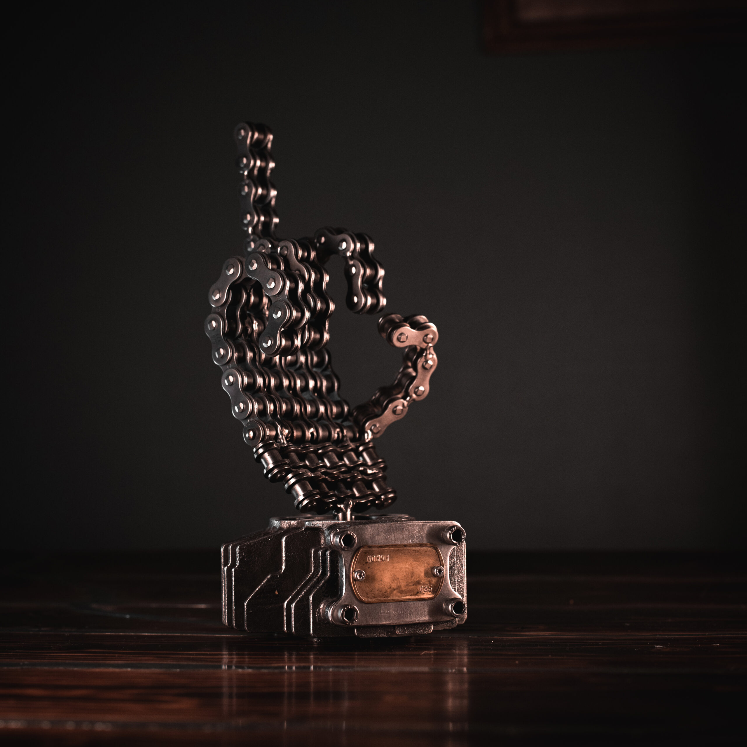 Assemblée maillon par maillon, John fige un geste devenu symbole: l’ultime avertissement, tendu comme un rappel à la determination pure… La main, entièrement façonnée à partir d’une chaîne mécanique recyclée semble surgir d’un futur en ruine. Le socle, issu d’un bloc moteur, ancre la pièce dans la matière brute. Inspiré de la saga de James Cameron, John rend hommage non pas à a guerre contre les machines, mais à la résilience – cette capacité farouche à se relever, encore et encore, même lorsque tout semble nous acculer.