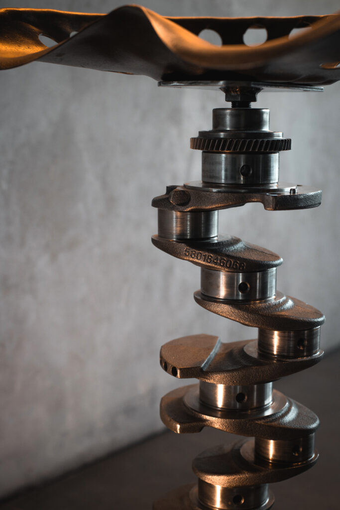 Ce tabouret détourne deux univers différents: l’industrie & l’agriculture. Le vilebrequin, pièce maitresse du moteur et donc habituellement cachée devient ici colonne centrale, révélant ses courbes et contrepoids comme une sculpture industrielle. L’assise en acier, un ancien siège de machines agricole du siècle dernier apporte une dimension historique et ergonomique marquée par le temps qui passe. La pièce conjugue robustesse, équilibre et élégance brute. Objet fonctionnel avant tout, il s’impose aussi comme une oeuvre où la mécanique raconte sa propre mémoire, celle d’un temps révolu.
