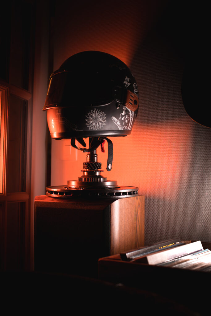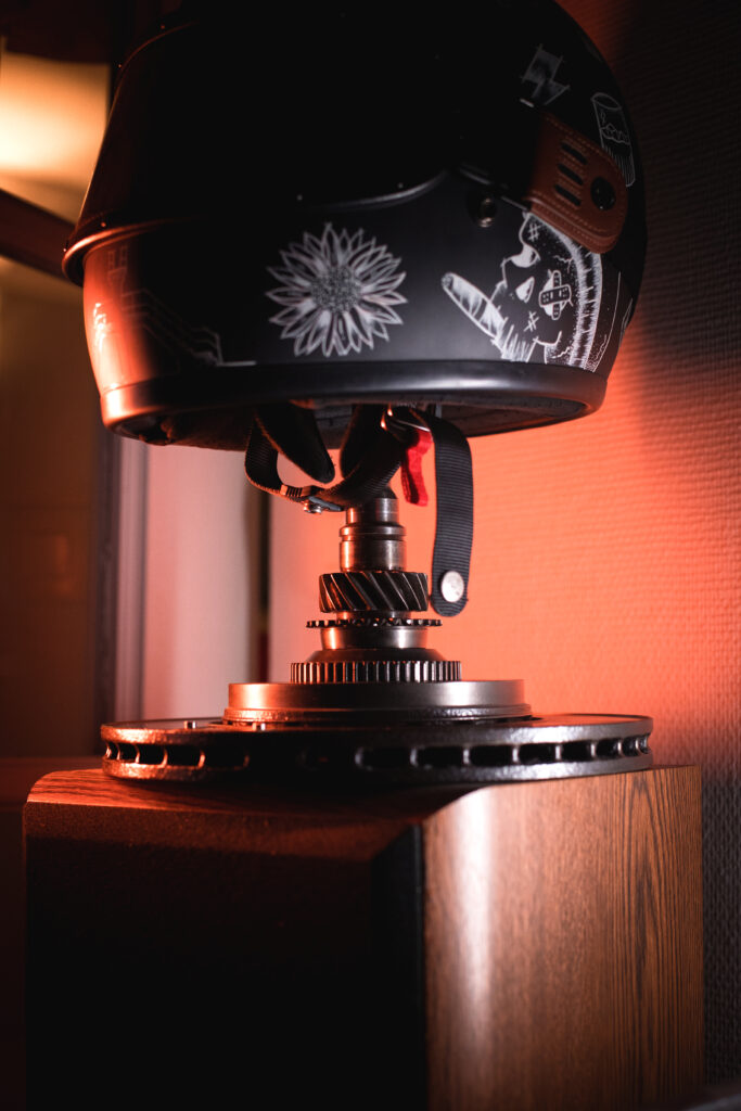 Cette pièce met en scène une superposition précise de pièces mécaniques issues d’univers techniques différents: disque de frein, arbre primaire de transmission, poulie de distribution. L’ensemble compose une base solide presque architecturale où la géométrie industrielle crée des lignes concentriques et un rythme visuel régulier. La verticalité centrale, obtenue par l’empilement d’éléments d’usinage, affirme une silhouette compacte et élégante. Cet objet s’impose également comme une pièce sculpturale, révélant l’esthétique inhérente des composants mécaniques lorsqu’ils sont extraits de leur fonction initiale et réassemblés dans une logique de design.