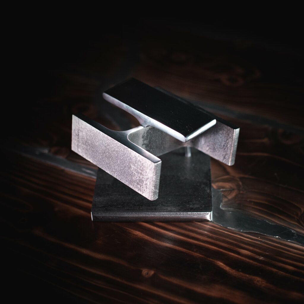 Ici chaque fragments de métal semble flotter entre deux mondes, l’un régi par le poids, l’autre par la possibilité d’un mouvement encore inconnu. Ces tranches de HEA se dressent comme des pierres angulaires détachées de leur fonction première. Ils ne portent plus rien, sinon le silence de leur propre présence. Cette oeuvre tient par un souffle, contemple la gravité mais ne s’y soumet pas. Les masses se répondent, se contredisent, s’accordent. L’ensemble tient dans un équilibre improbable, presque fragile. Une petite mécanique poétique où l’acier lourd, dense et têtu adopte la grâce d’un geste retenu.